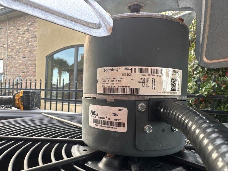 Completed after-hours warranty replacement of failed condenser fan motor on outdoor HVAC unit. Installed new Genteq motor assembly, verified proper electrical connections, and confirmed operational status of condenser fan system upon startup.